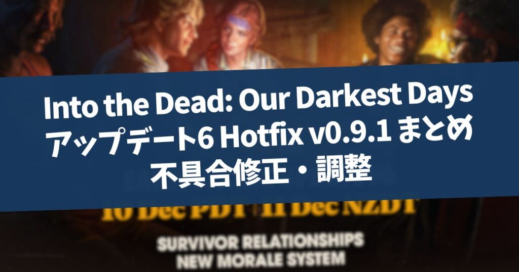 2025年12月11日にInto the Dead: Our Darkest Daysのアップデート6が配信されてから、初めてのHotfixとなるv0.9.1が2025年12月15日未明に配信されました。アップデート6の配信直後から複数のバグが確認されており、今回のHotfixの大半はそれを修正するもの... -
