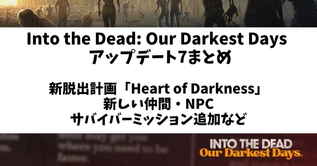 本記事では2026年1月15日(木)に配信された『Into the Dead: Our Darkest Days』のアップデート7(Update 7)の内容を解説します。トレーラー等で予告の通り新たな脱出計画(新エンディング)「Heart of Darkness」が実装される大規模アップデートとなっ... -