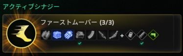 | ファーストムーバー | ・オーバークロック済みコア ・クイックロードアダプター ・ベヨネット(コンパクト) | ・スタックごとに攻撃力∔5%(最大50%) ・スタックごとに移動速度+5%(最大25%) ・スプリントしていないときは1秒ごとに1スタックを失う。 |