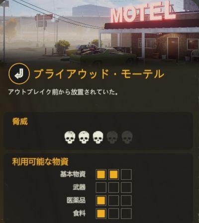 ブライアウッド・モーテルは、探索ルートが複雑でゾンビも多く、物資の効率面ではやや劣ります。