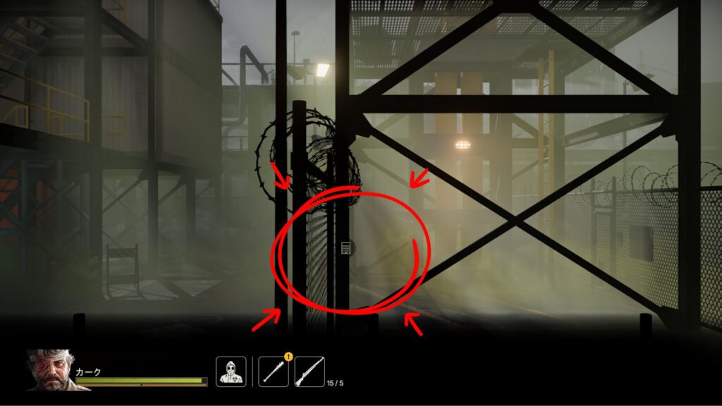 視界不良で奥側のゾンビを見落としやすいため、静音性が高い武器の使用を推奨します。