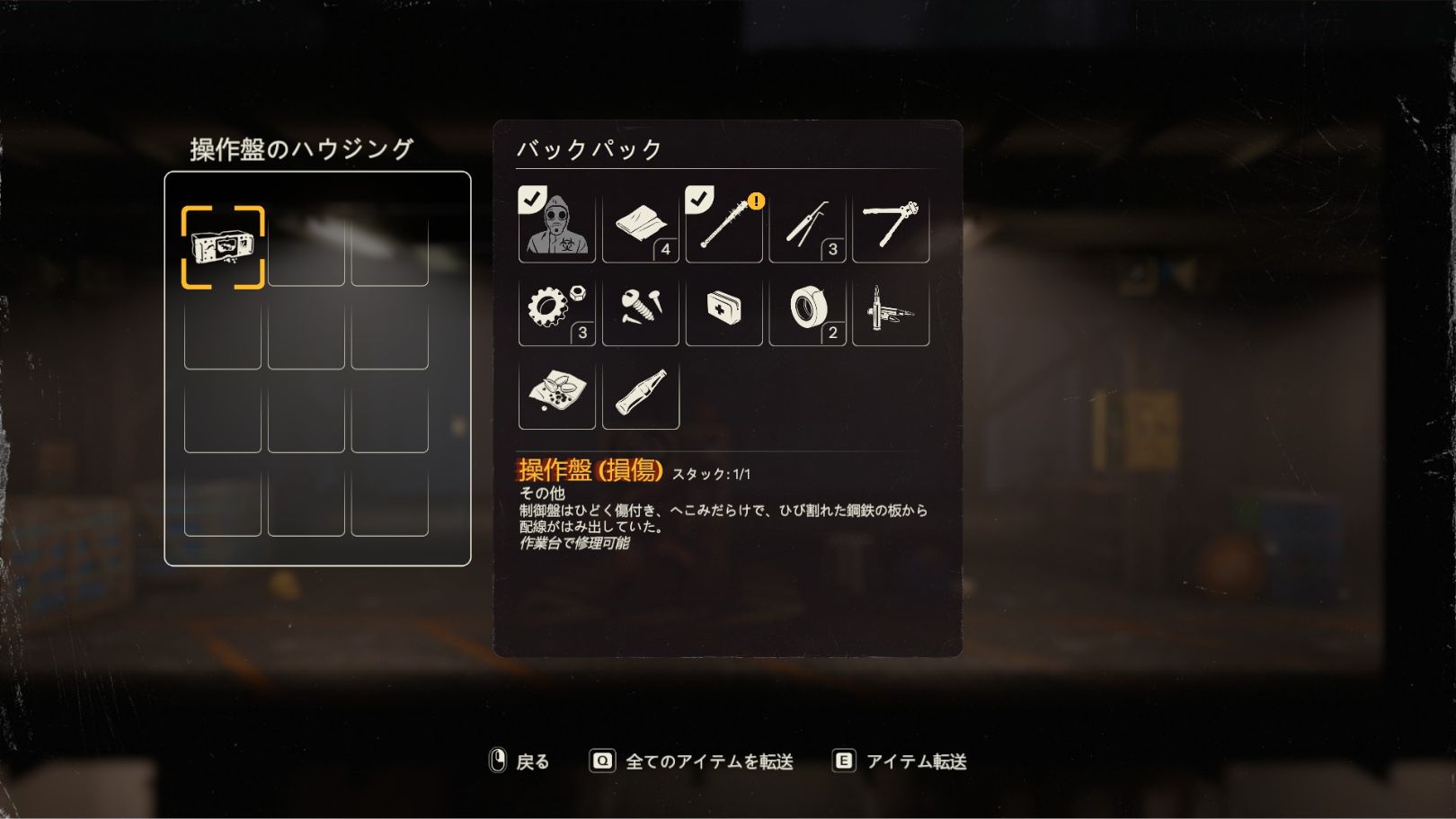 | 建物3階の右奥の部屋にある本棚(※ここだけは労働者用キーコードなしでアクセスできる探索ポイント) | 留め具、ジャンクフード×4、治療キット、銃器の部品×3 |
