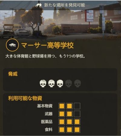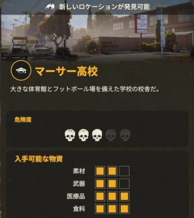 マーサー高等学校は、物資回収と拠点用キャラクター確保の両面で優秀な探索地です。