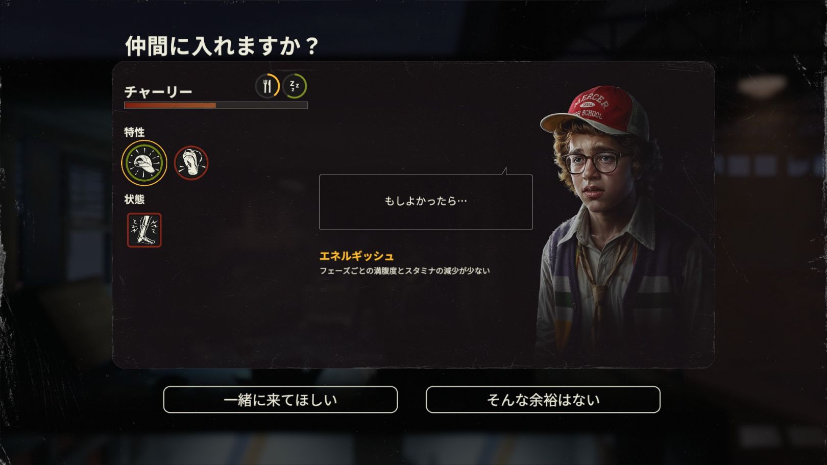 またチャーリーに話かけると仲間に加えるかの選択肢が出ます。