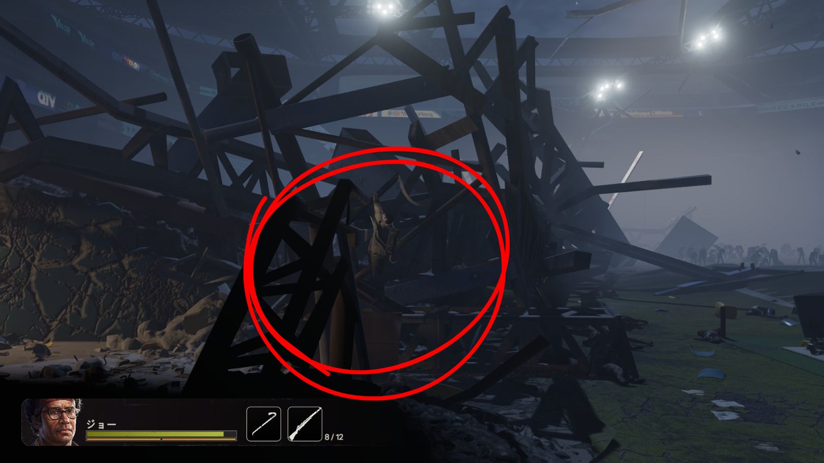 スタジアムの内外では大量の感染者が徘徊しており、これまで実装されてきた探索地の中で屈指の難易度を誇ります。