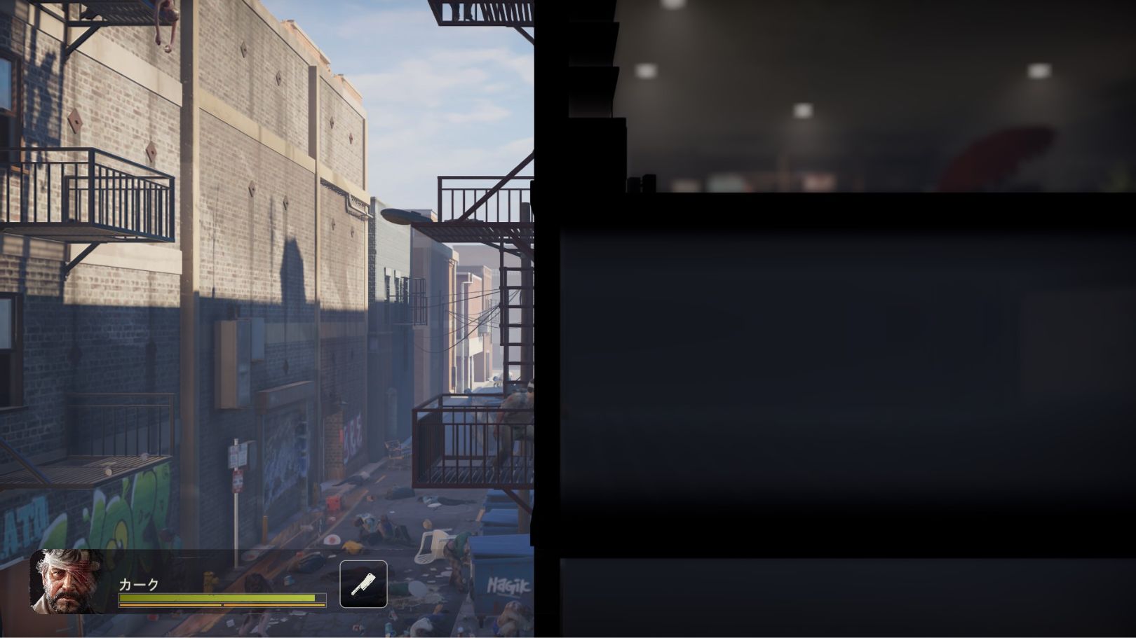※脱出ではなく探索・ゾンビ掃討を行う場合は、まずこの武器を入手してください。左側のビルではナイフ系武器でステルス・キルを最低でも1回はできる状態にしなければ探索が安定しません。