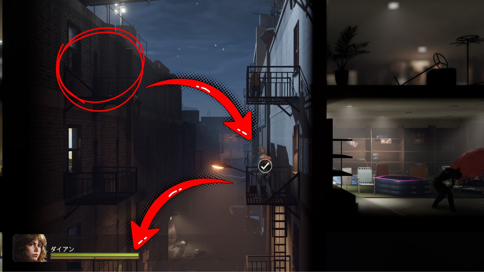• ハシゴとぶら下がり落下で2階まで降り、ビル内に入って階段室で鉛パイプ(武器)を回収。