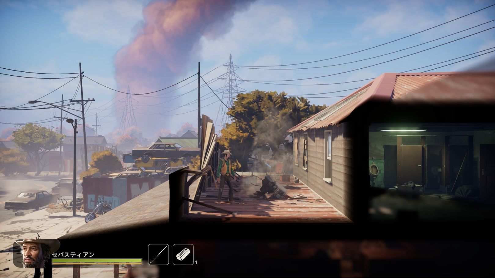 アシュビー・ホーダーの家などアシュビー地区の探索地で脱出計画【スピルゾーン】のトリガー(大爆発)を起こした後に、サーティ・オート・シックス・バーへ訪れると2階の屋根部分に瓦礫が飛来しているのを確認できます。