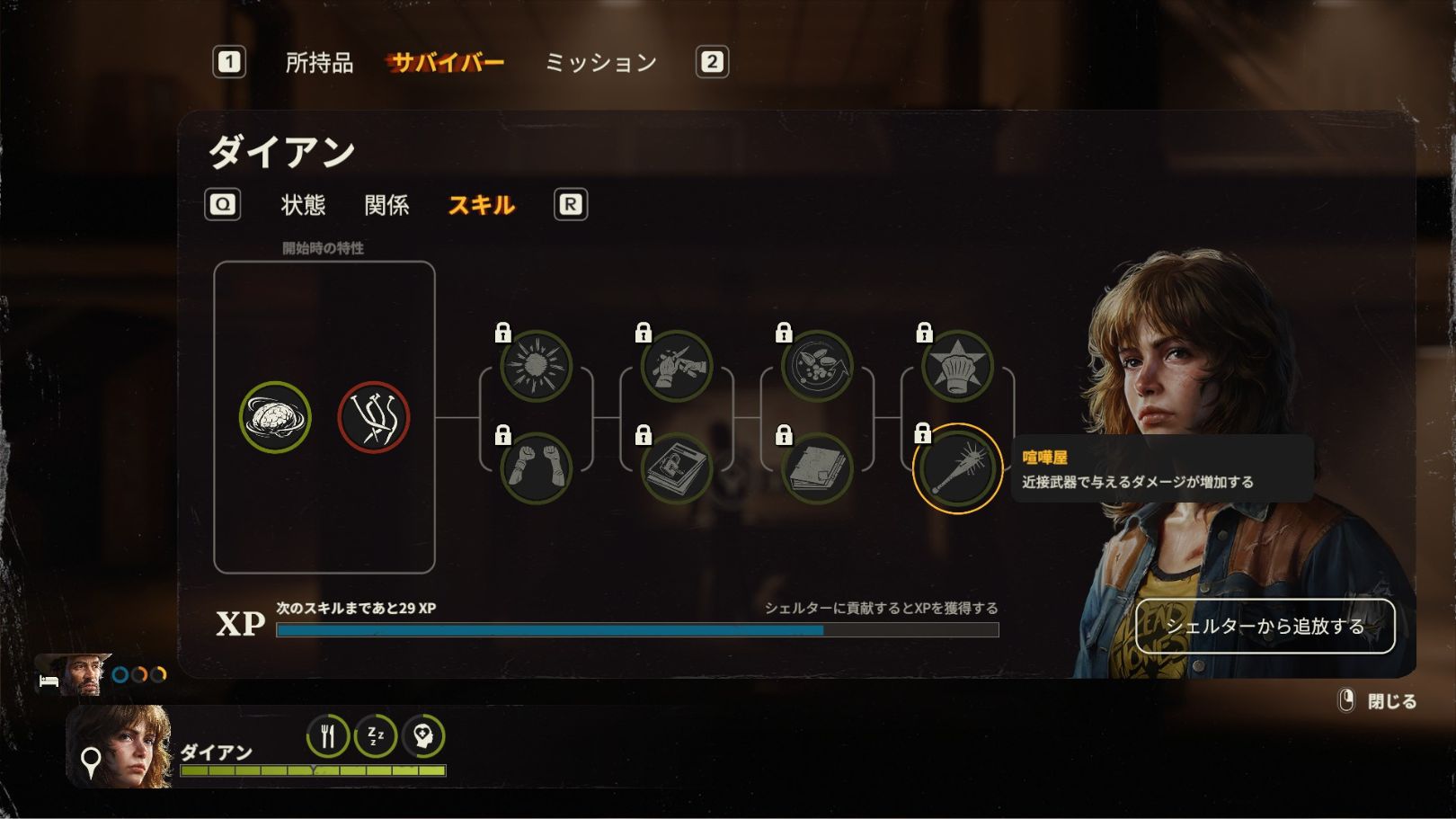 逆に整理整頓(バックパックの容量が1増加する)+喧嘩屋(近接武器で与えるダメージが増加する)を選択した場合は、戦闘・探索向けのキャラクターに成長させることが可能になります。